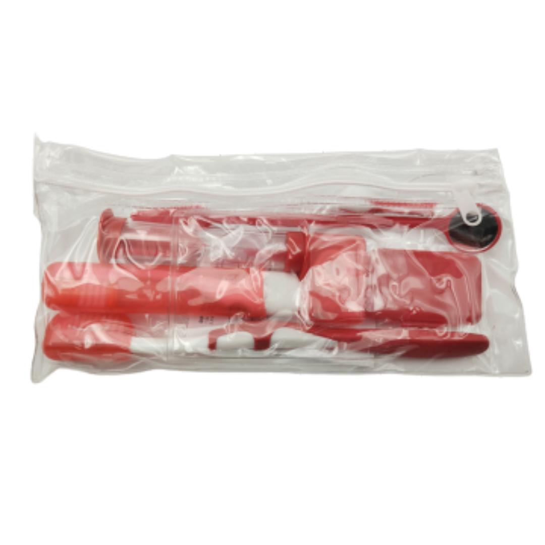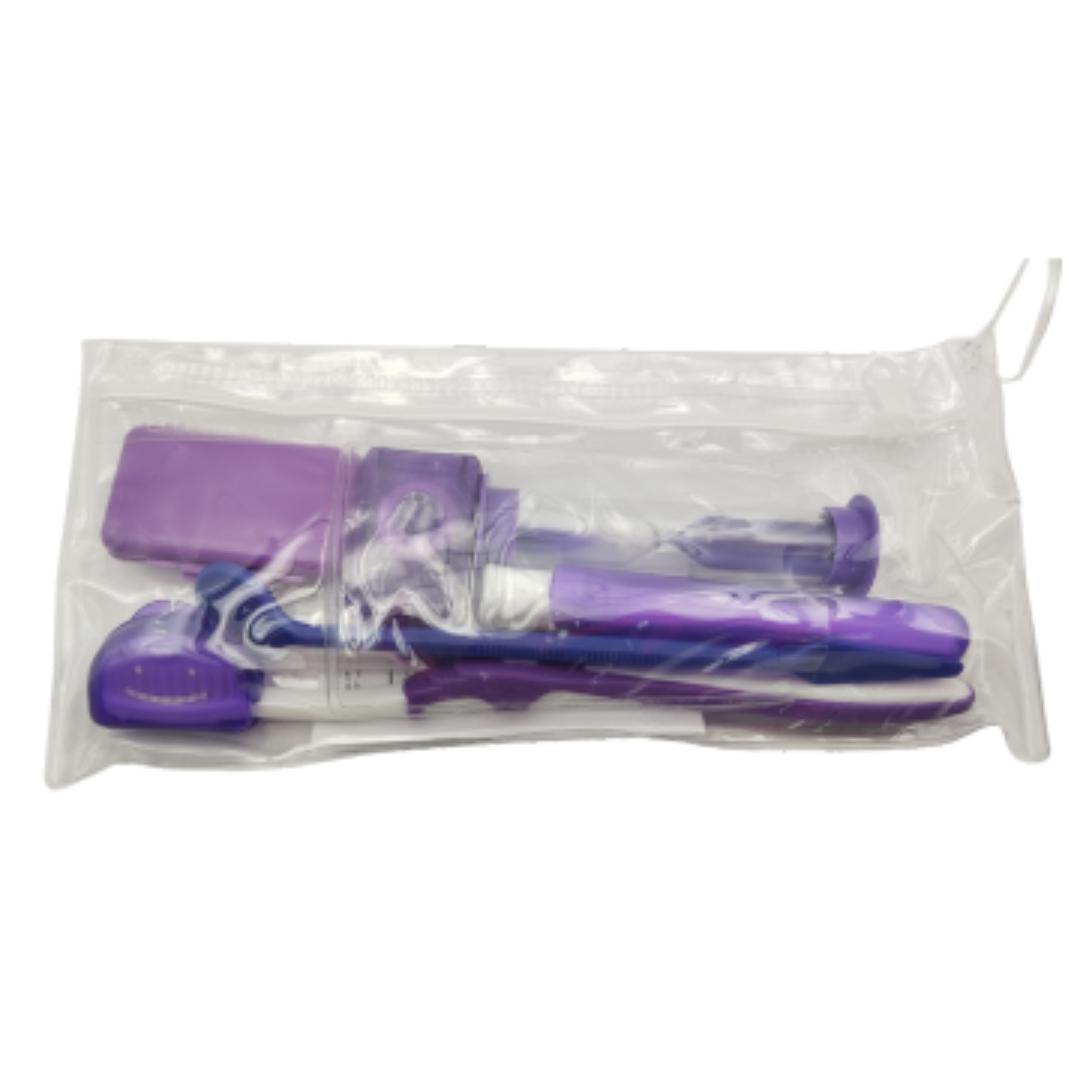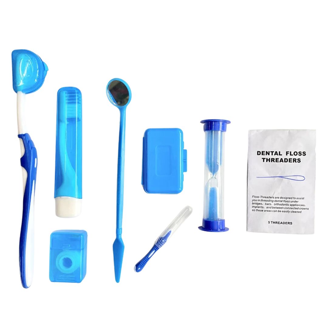 El kit de limpieza para ortodoncia incluye: Cepillo dental para ortodoncia, cepillo dental viajero, espejo odontológico, reloj de arena, estuche de cera de alivio, hilo dental y un estuche.